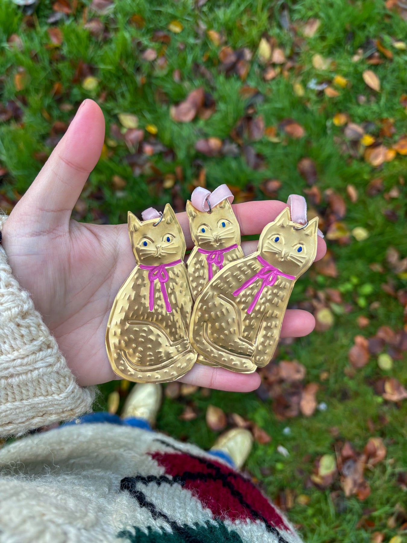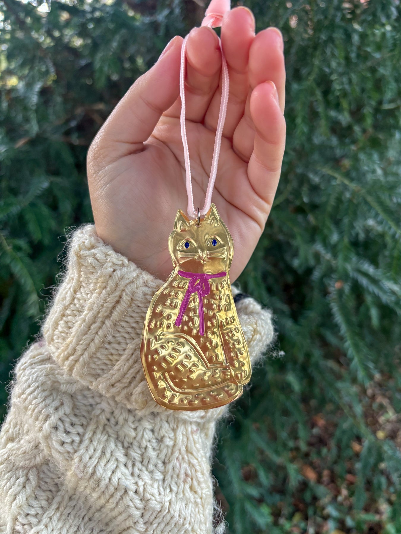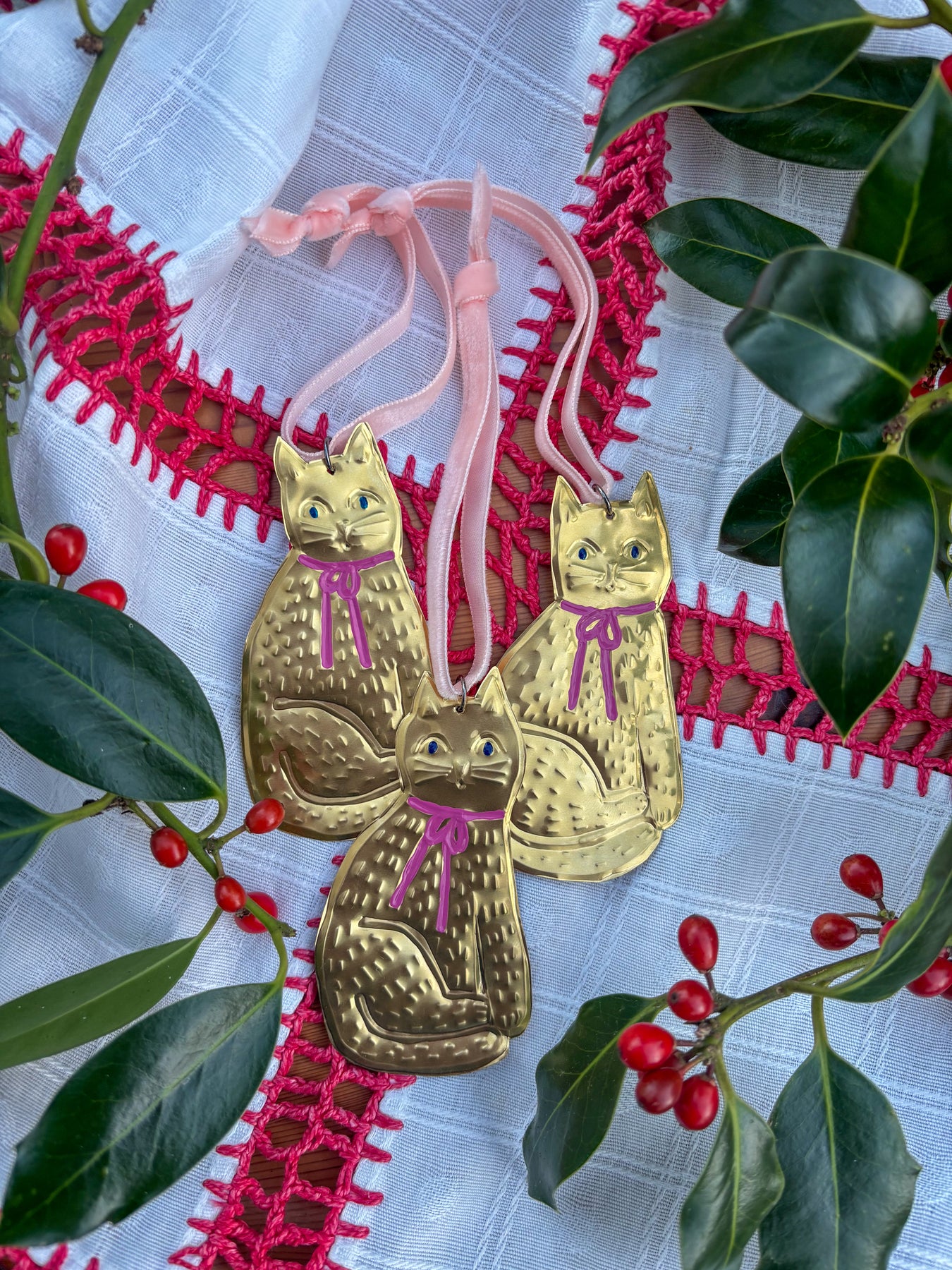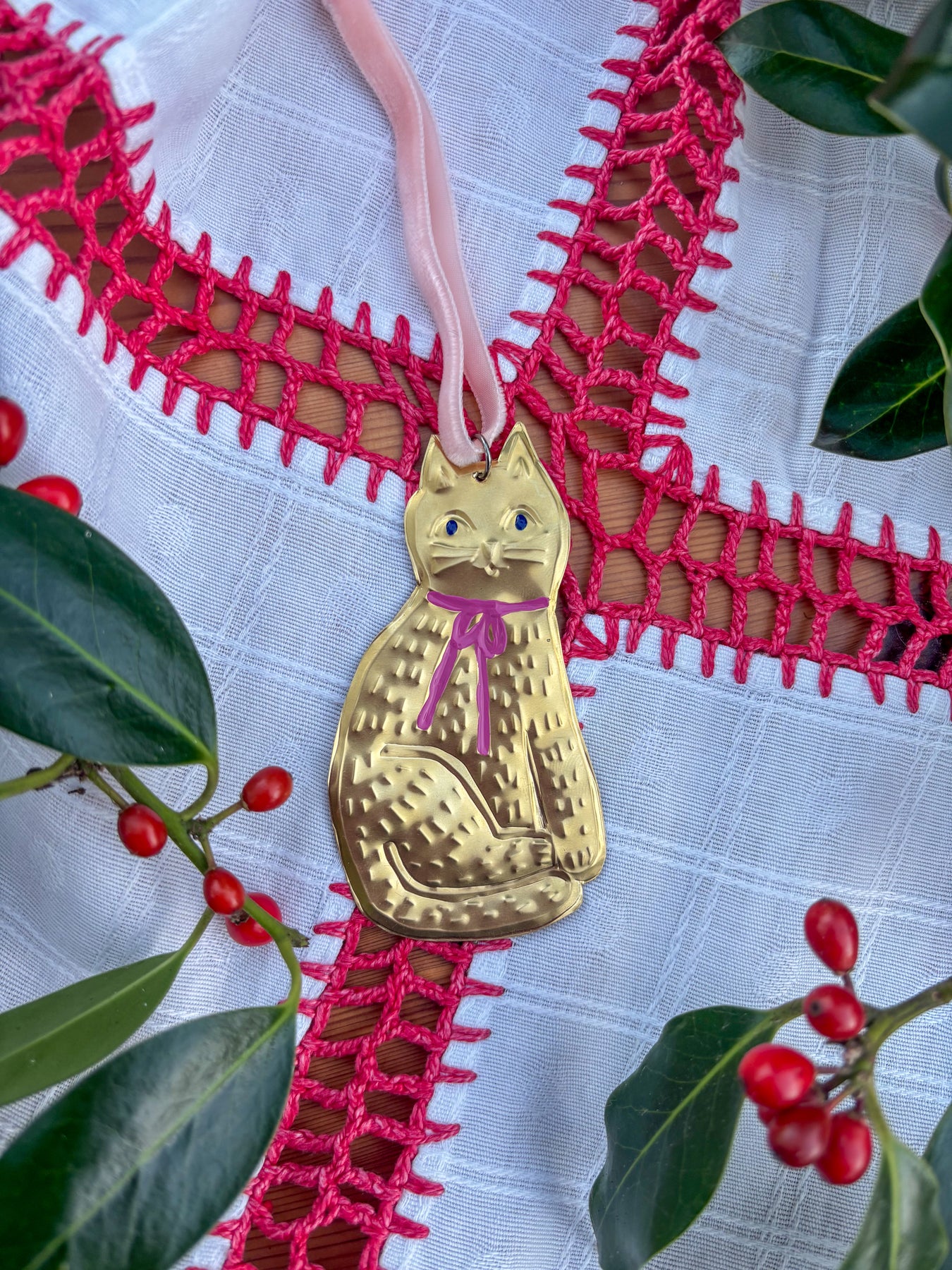 For all my fellow cat lovers, these hand-embossed decorations will bring a golden glow and cheeky cuteness to your Christmas tree. Each decoration is strung onto velvet ribbon to match the hand-painted bow adorning the Kitty's neck.