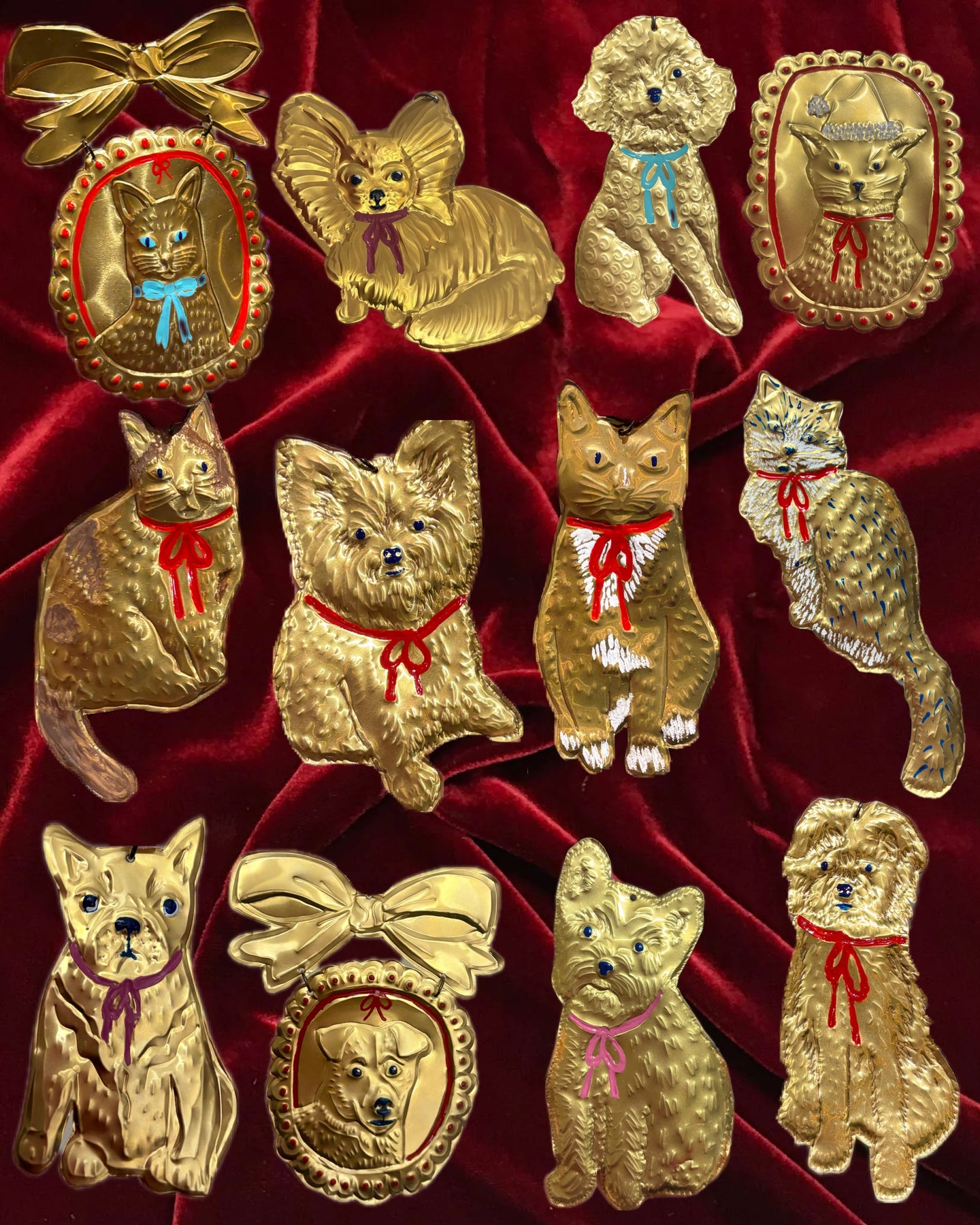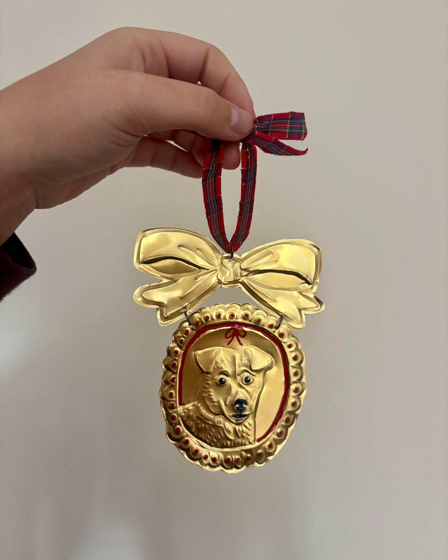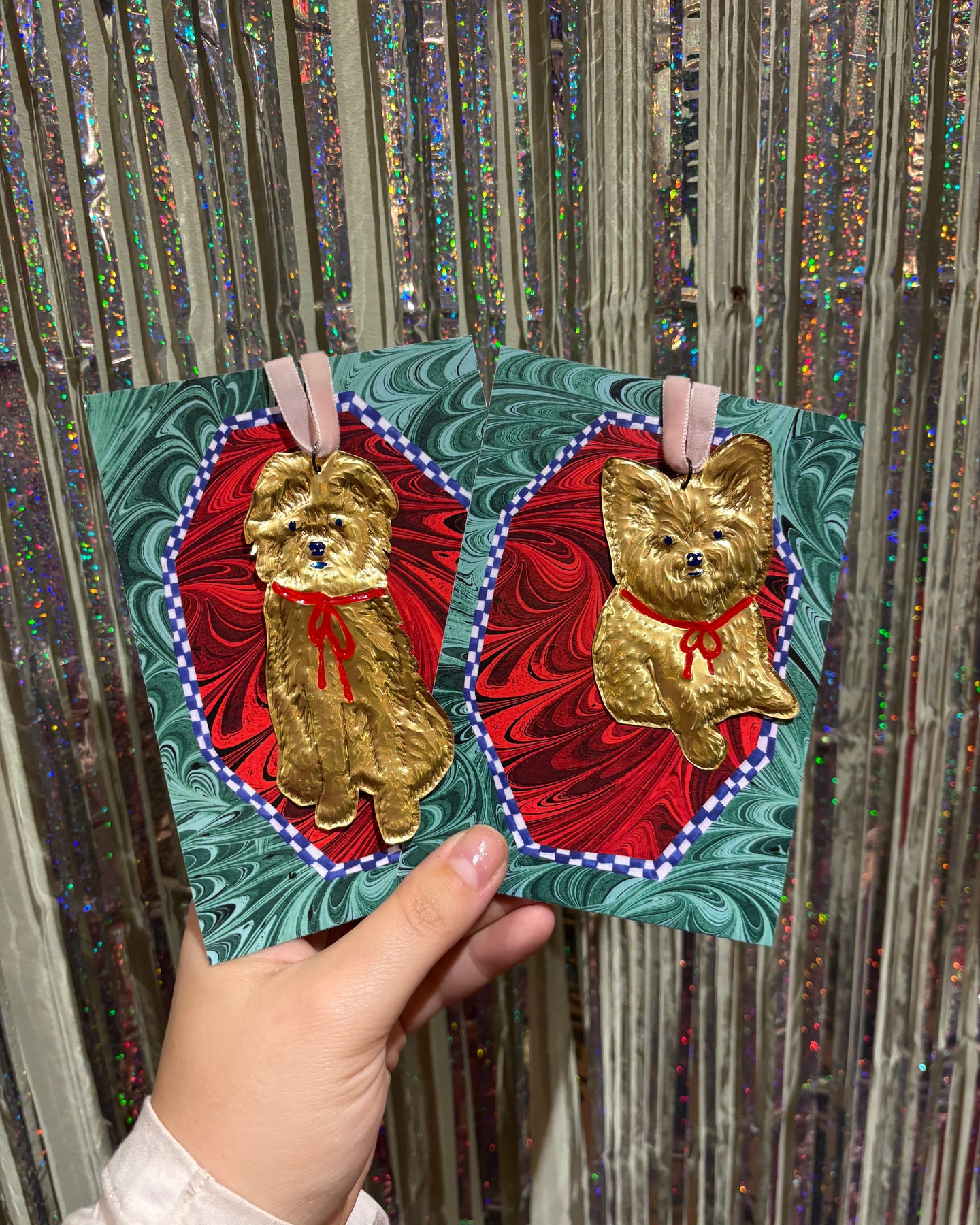 Your animal bestie immortalised as a glorious golden decoration. Capturing your pets character in bespoke embossed brass, finished with a velvet ribbon to hang from. I’m offering slots for decorations that will be made and after January 20th. You can choose from a single full body style or a framed portrait style, with an added detail, this detail could be a bow (as shown) or could be your pet’s name, or their favourite food or toy, anything that makes you think of them.